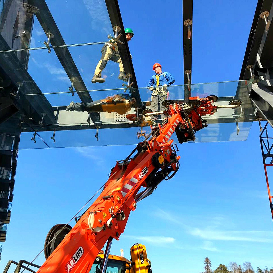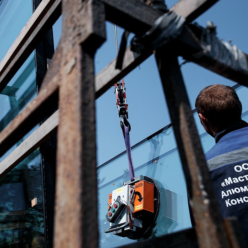 Монтаж стекла с помощью вакуумных захватов компании Арлифт.