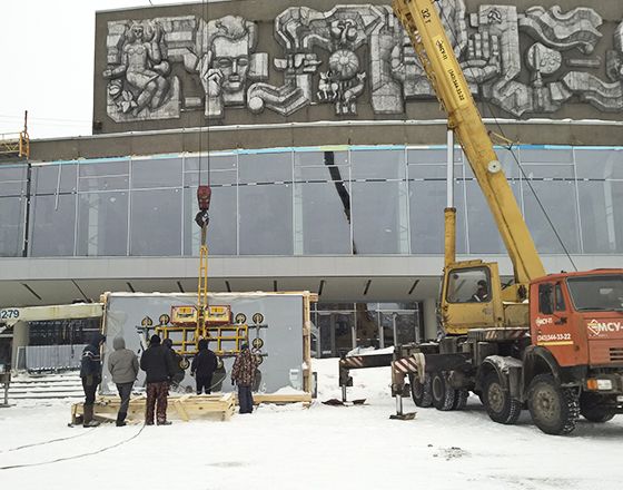 Вертикальный монтаж двадцати шести стеклопакетов производился компанией «Гласс-строй» (Екатеринбург) при средних температурах от -10 до -25 градусов. Оборудование ни разу не подвело, все работы были завершены в установленный срок.