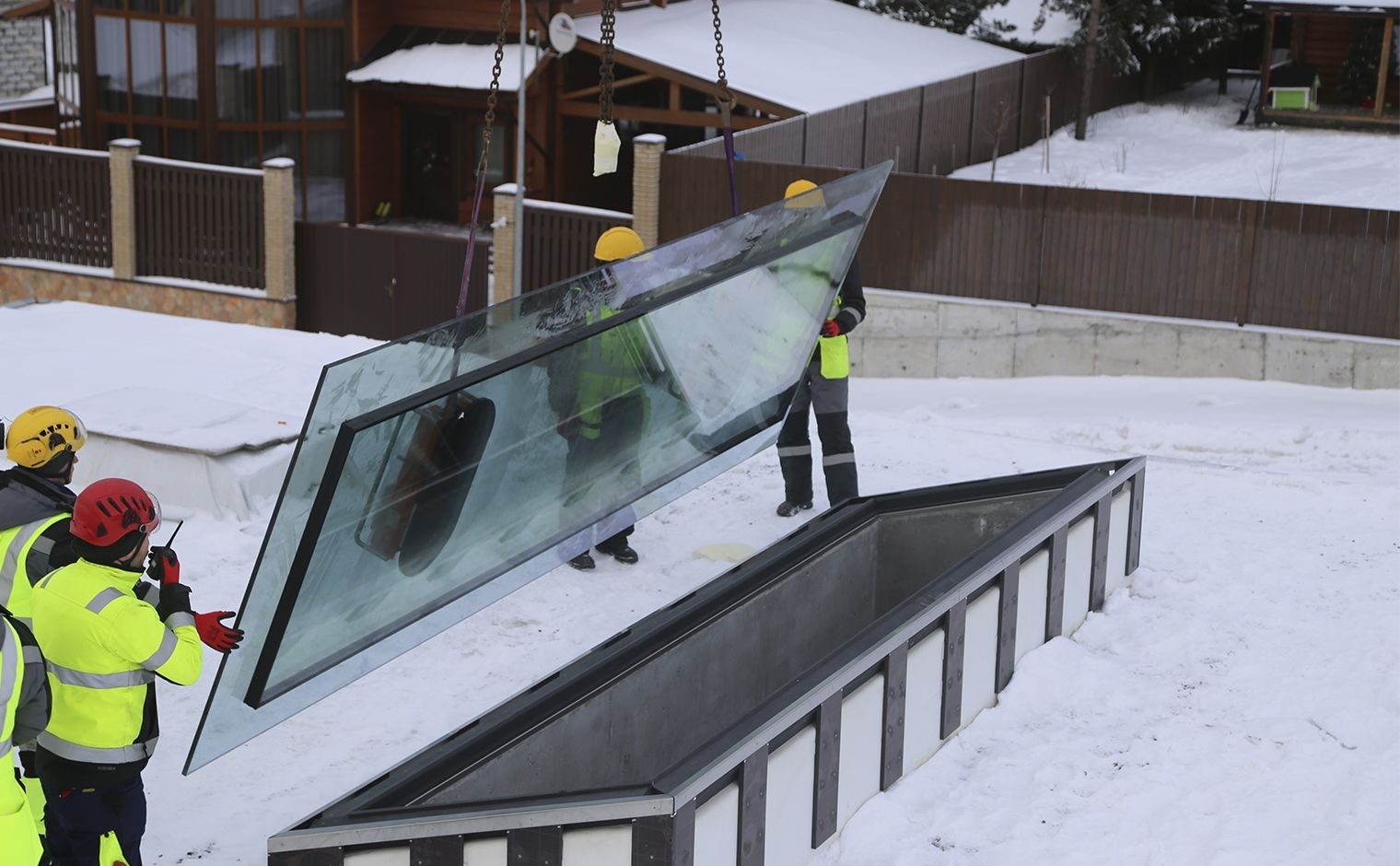 Для решения первой задачи был применен наш «эксклюзив» - вакуумный захват ARLIFT-F/R-1500. Оборудование использовалось вместе с траверсой и без труда, несмотря на минусовые температуры (монтаж производился в середине января при температуре -11Со), справилось с остеклением панорамных окон. Из-за большого веса стекла монтаж производился в горизонтальном положении.