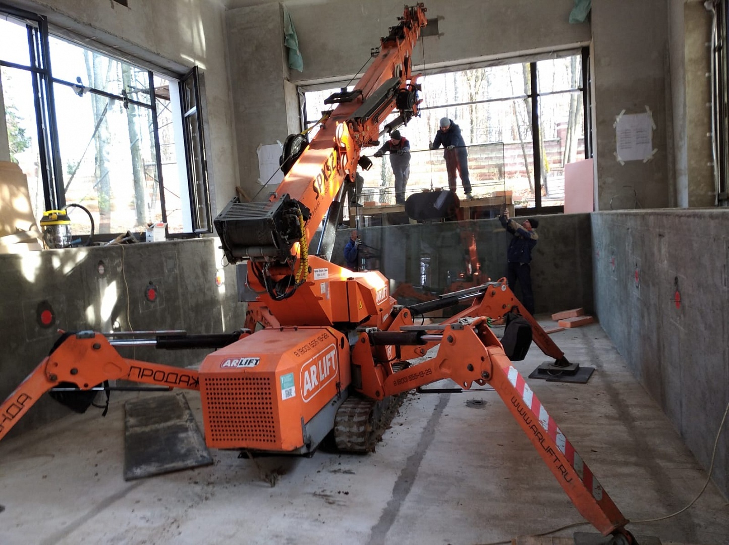 При остеклении бассейна в одном из строящихся домов использовали мини-кран Арлифт SPX527 и вакуумный захват Arlifter GS-850. Главная сложность исполнения заключалась в том, что мини-крану необходимо было спуститься по деревянному пандусу на дно бассейна, и оттуда производить работы. С этой задачей техника Арлифт справилась на отлично!