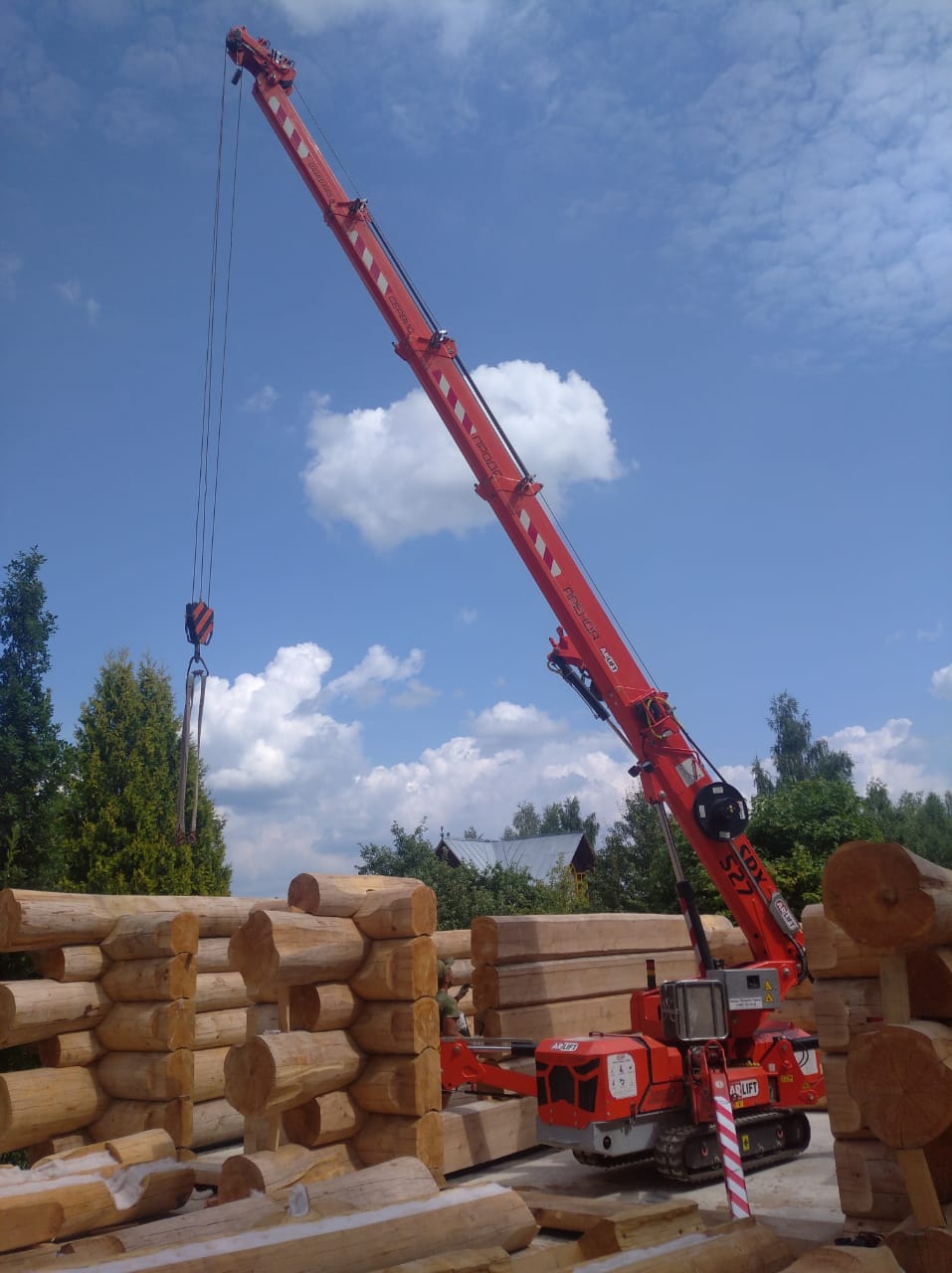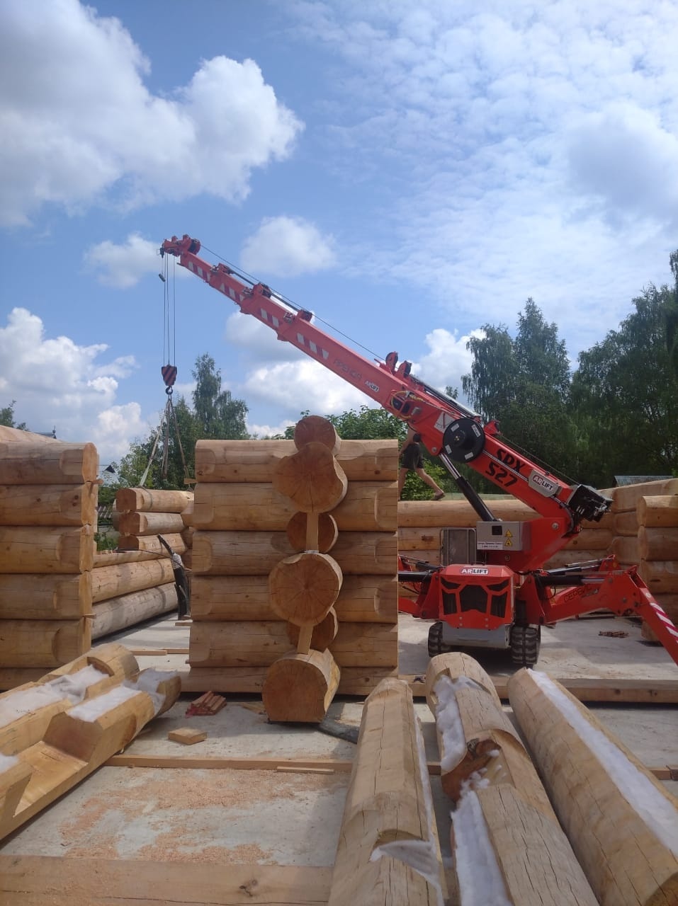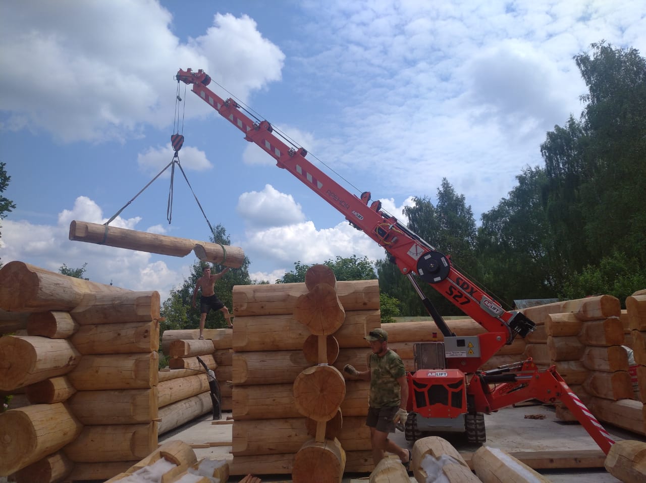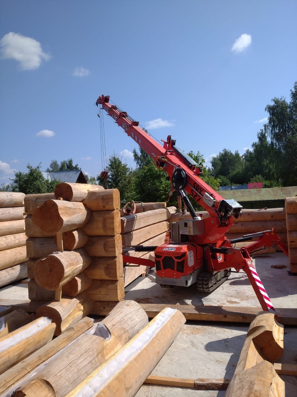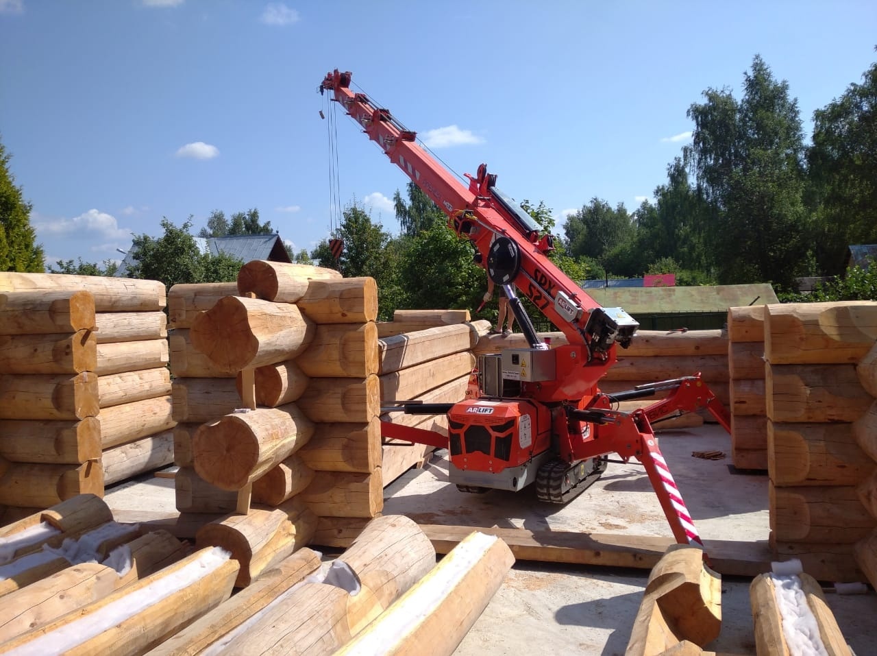 Дома из оцилиндрованного бревна являются экологичной альтернативой каркасным и газобетонным строениям. Помимо этого, к их преимуществам можно отнести энергоэффективность, а также простоту и скорость сборки, особенно, когда за дело берется мини-кран Арлифт. Монтаж бревен весом до 1,5 тонн был закончен всего за 4 дня.