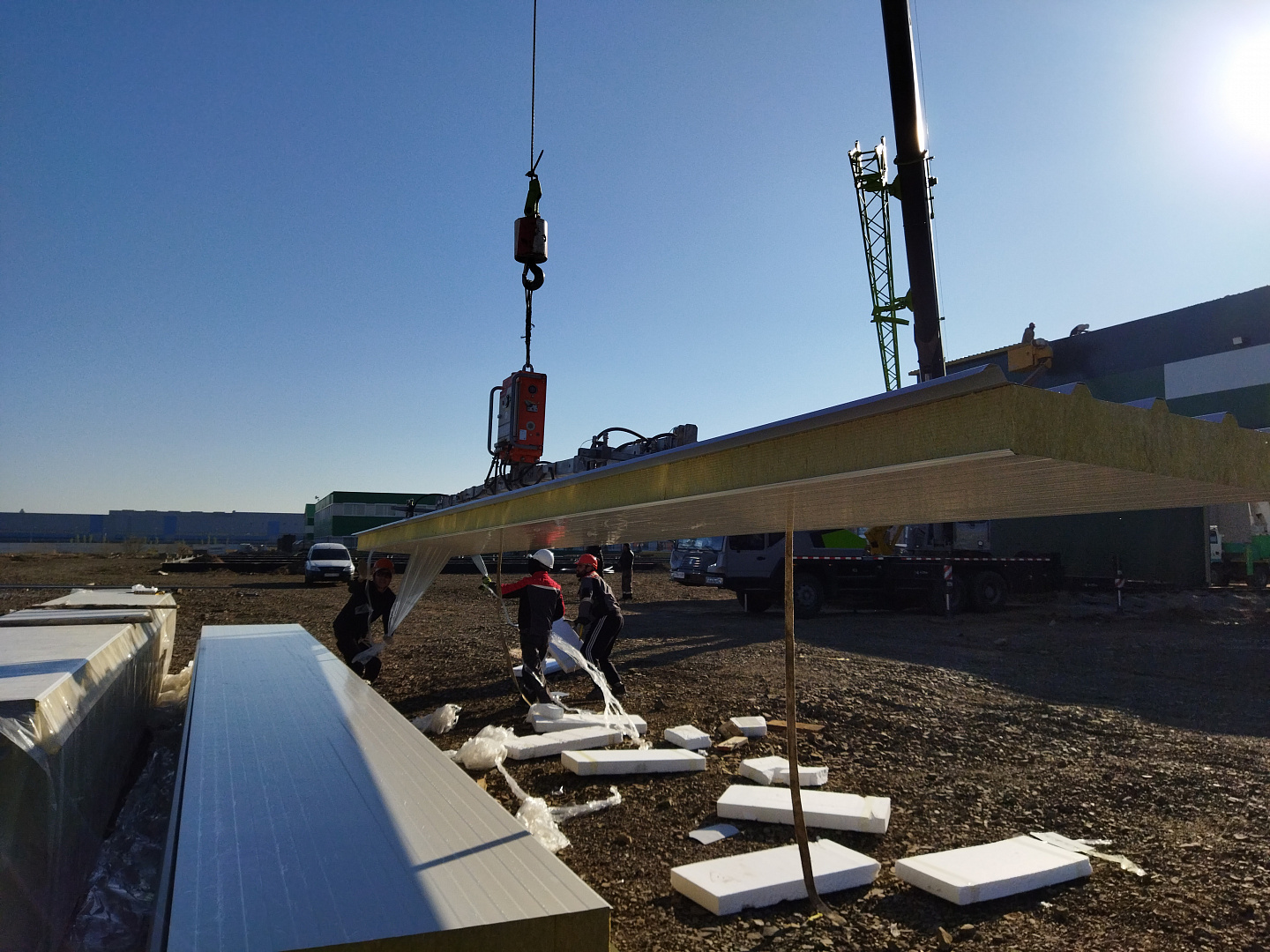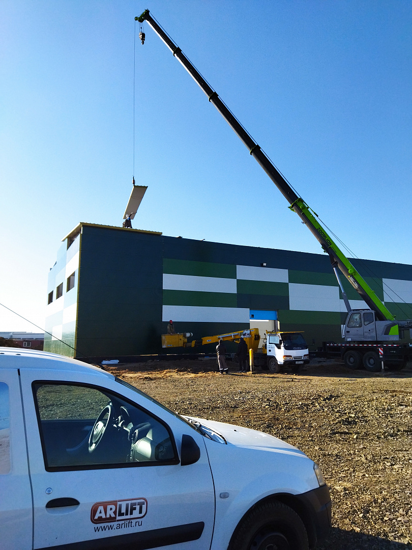Сооружения из сэндвич-панелей настолько универсальны, что позволяют строить не только склады, птицефабрики, но и целые производства. Так, при строительстве кровли цеха по производству бетонных изделий использовали профессиональное вакуумное оборудование Arlifter SP-4, собственного производства компании Арлифт.