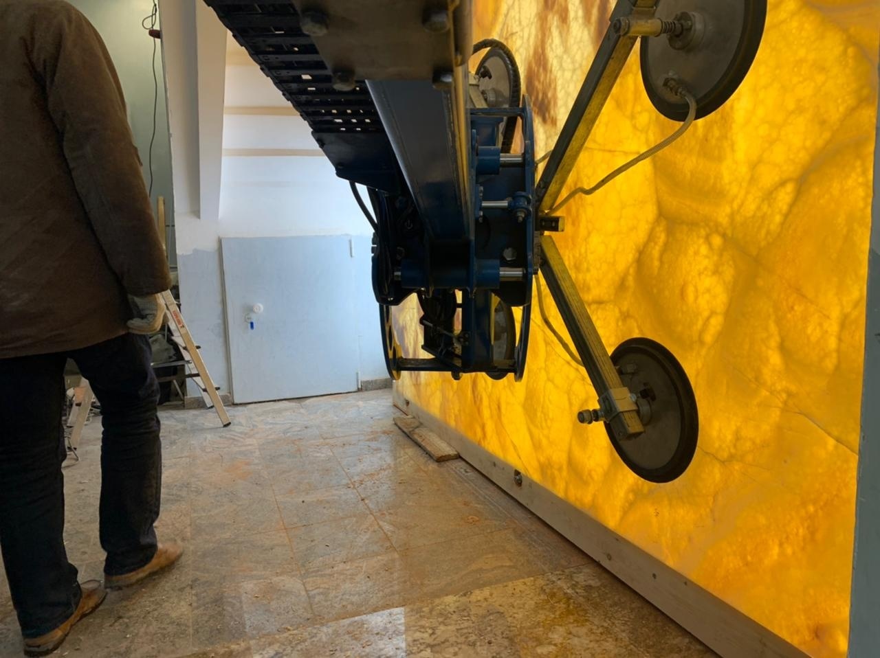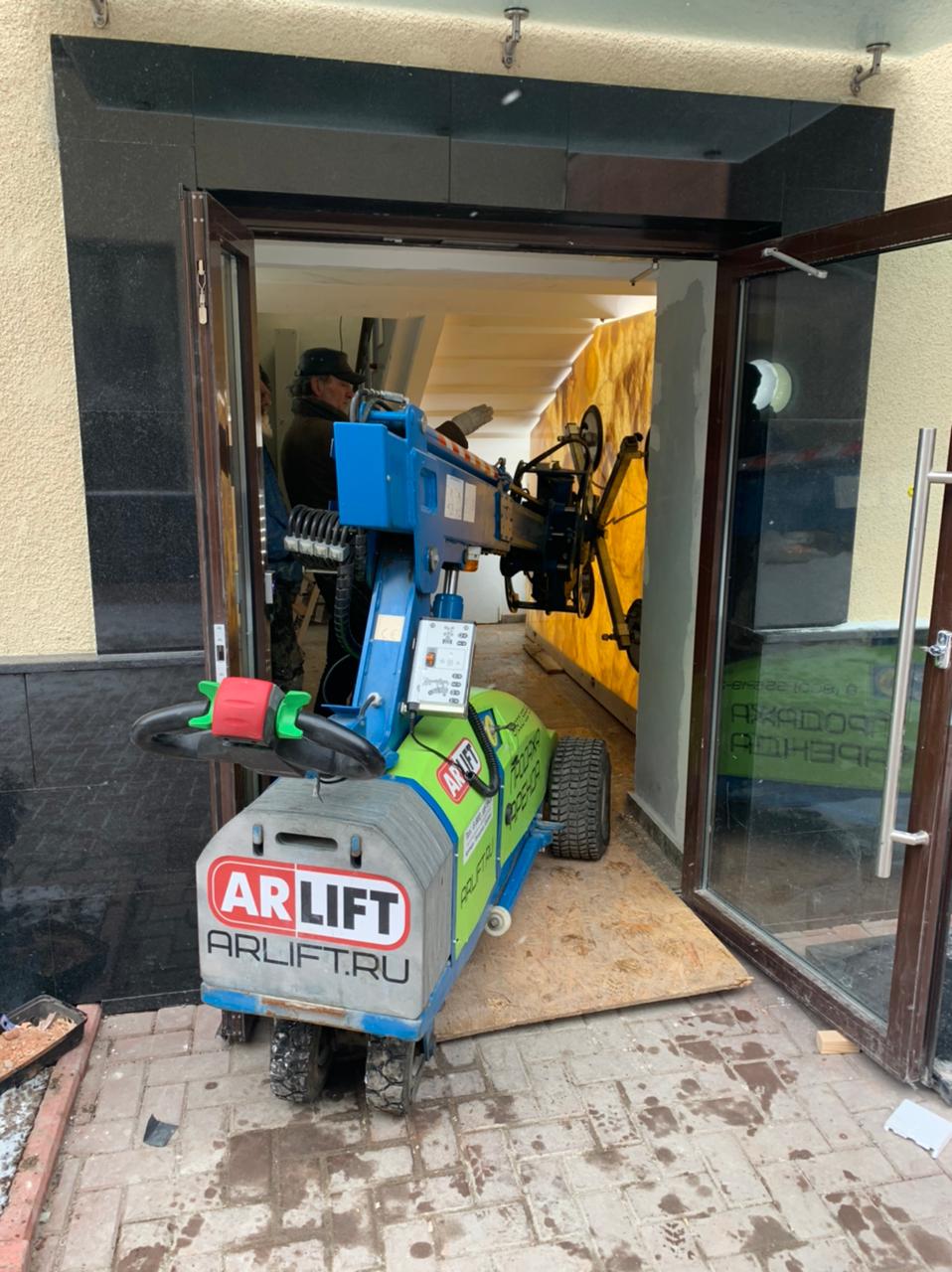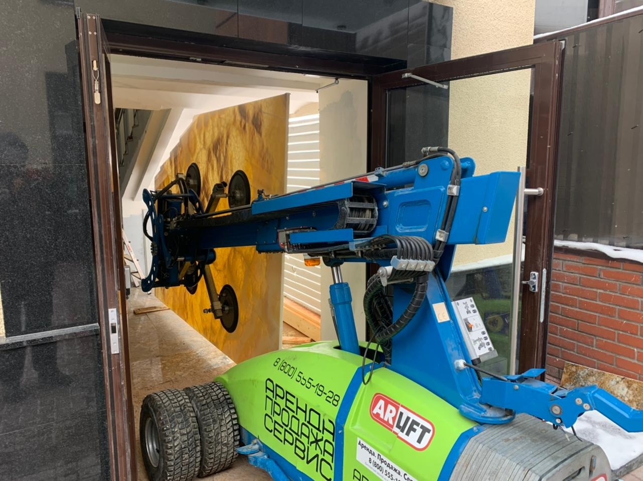 Так при установке мраморного камня в одном из офисов Петербурга, главная трудность заключалась в том, что при размере плиты в 1800 мм на 2000 мм, размер дверного проема составлял всего 1250 мм на 1900 мм. Но благодаря конструкции стеклоробота, оператор может контролировать угол наклона и перемещать груз в разных плоскостях.