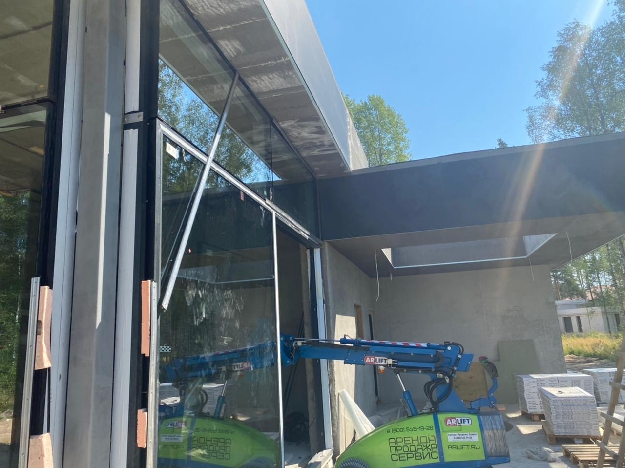 При строительстве и ремонте механизма двери весом около 400 кг и размером 3,5 х 3 м в одном из таких домов, был задействован стеклоробот или, как его еще называют, самоходный вакуумный подъемник для стекла с грузоподъемностью до 575 кг. Помимо этого, стеклоробот помог произвести остекление второго этажа стеклопакетами размером 7 х 1 м и весом 150-200 кг на высоте 4-х метров.