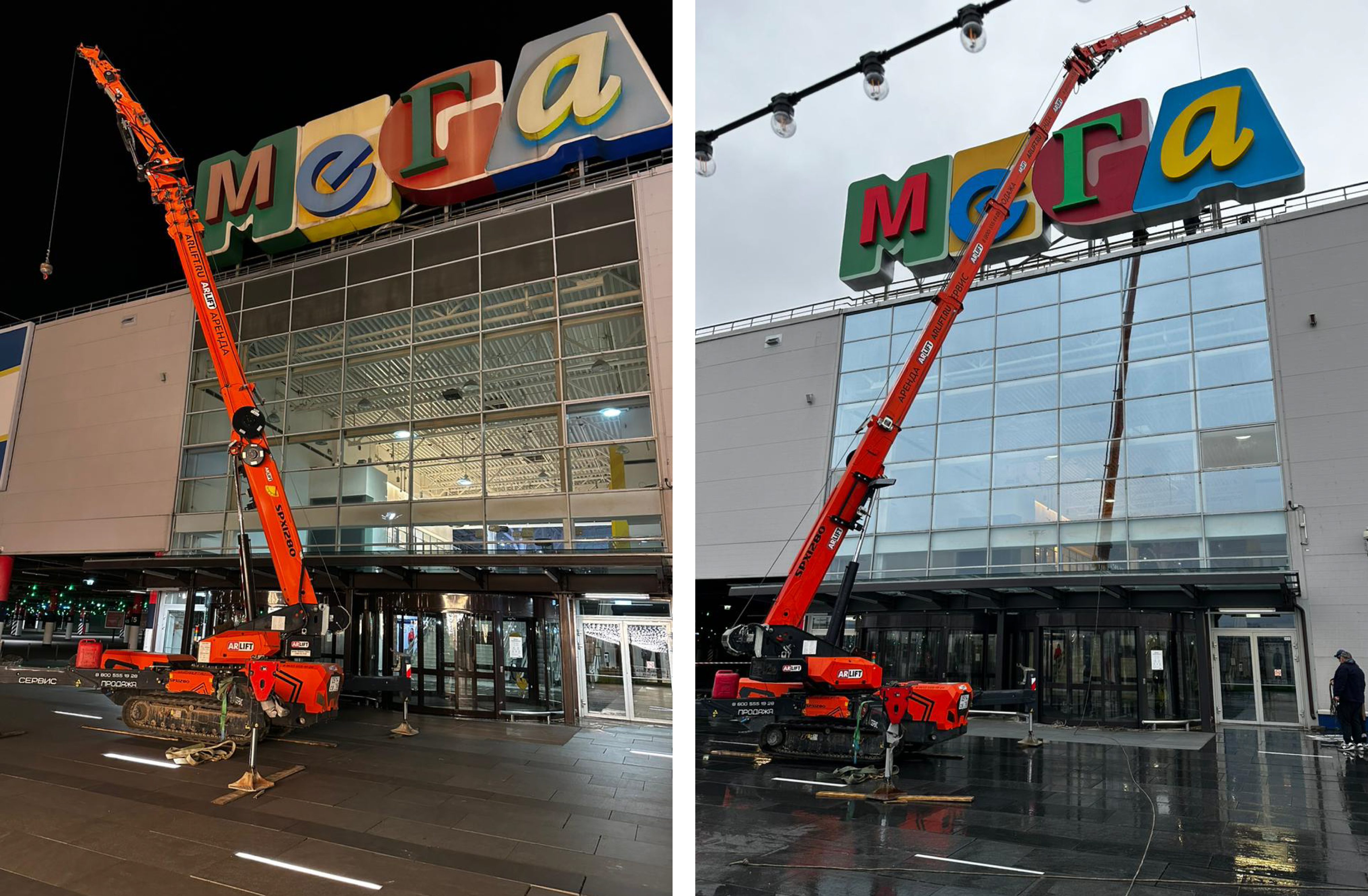 Так, на днях, мини-кран Арлифт SPX1280 помог одной популярной торговой площадке обновить вывеску. SPX1280 — один из самых производительных и мощных кранов Арлифт. Максимальная грузоподъемность оборудования составляет 8000 кг, при этом мини-кран сохраняет компактные размеры, которые обеспечивают ему отличную проходимость в узких проемах и позволяют размещаться на совершенно непригодных для других кранов поверхностях.