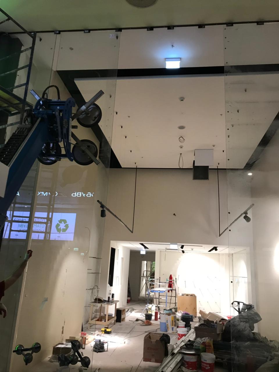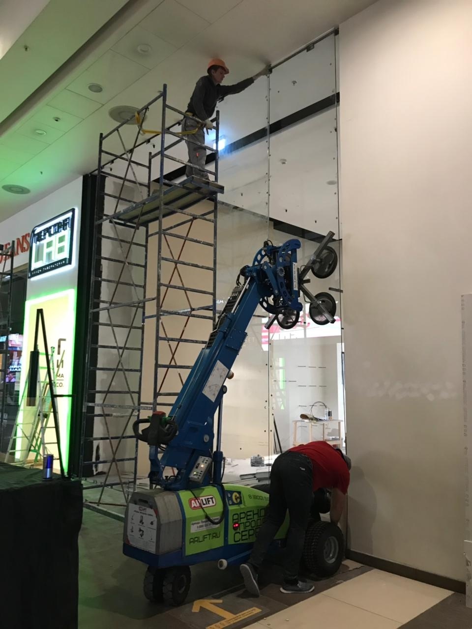 Монтаж крупногабаритного стекла 6 000 мм на 1 000 мм и весом в 180 кг осуществляли с помощью современной техники Арлифт – стеклоробота, предназначенного для монтажа и перевозки стекла, камня, мрамора, дерева и прочих гладких поверхностей. Максимальная грузоподъемность составляет 575 кг.