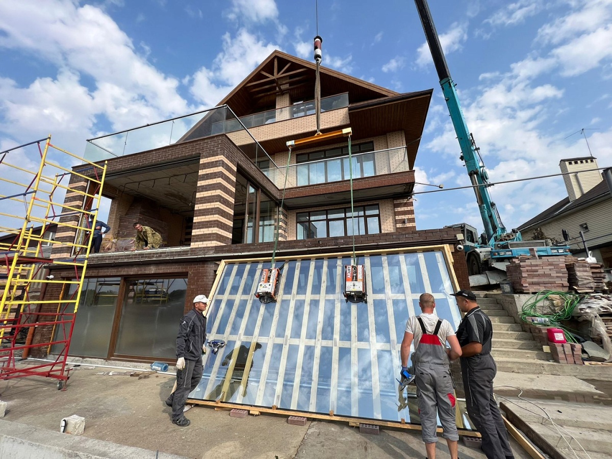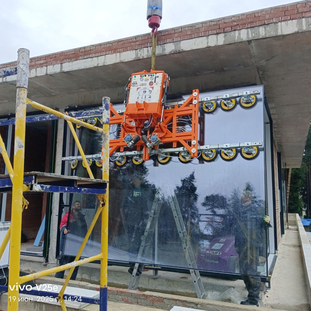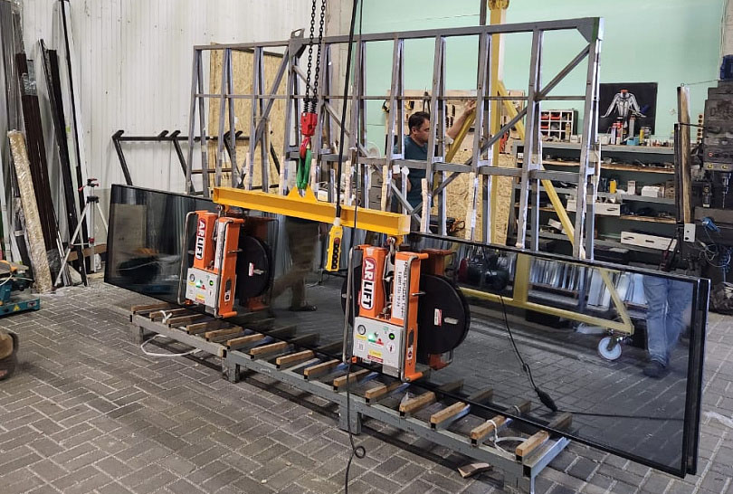 Траверса, вакуумные захваты Alifter, монтаж стеклопакетов